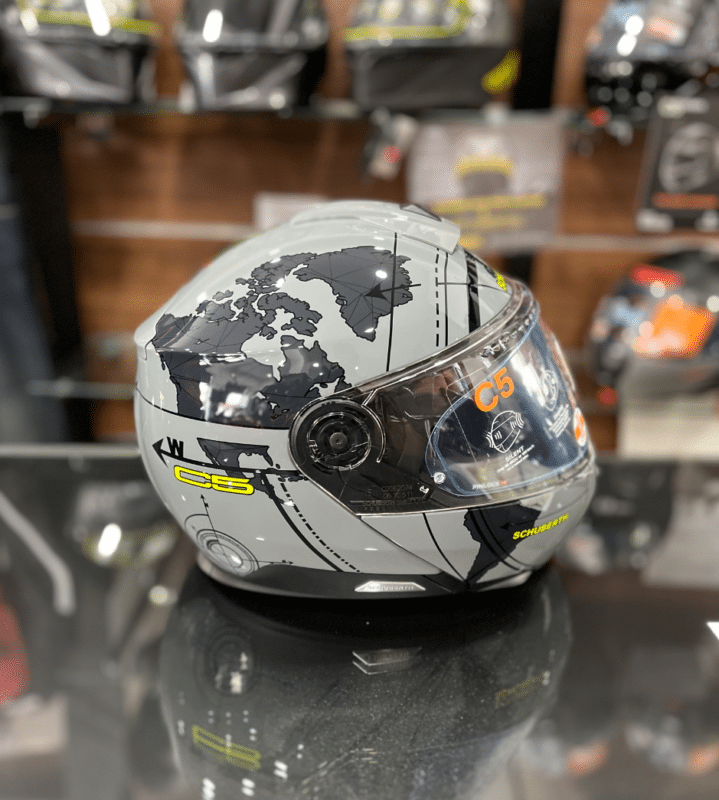 Découvrez le C5 Schuberth dans son nouveau coloris Globe Grey ! Le casque ultime pour les passionnés de motos qui allie confort et sécurité maximale ! Maintenant disponible dans une teinte avec encore plus de détails ! Affirmez votre personnalité sur la route avec le C5 Schuberth Globe Grey.